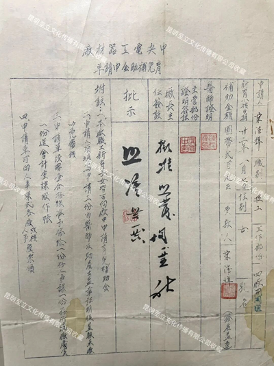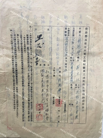 ▲1948年8月中央電工器材廠(昆明電纜集團前身)發(fā)放職工育兒補助金圓券20元。